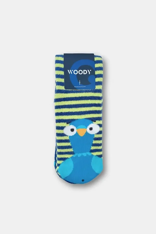 Set van twee paar sokken van fijn breiwerk. Ze hebben allebei een duivenprint. Eén paar is effen groenblauw met een groene boord, het andere paar heeft groene strepen en een blauwe boord.