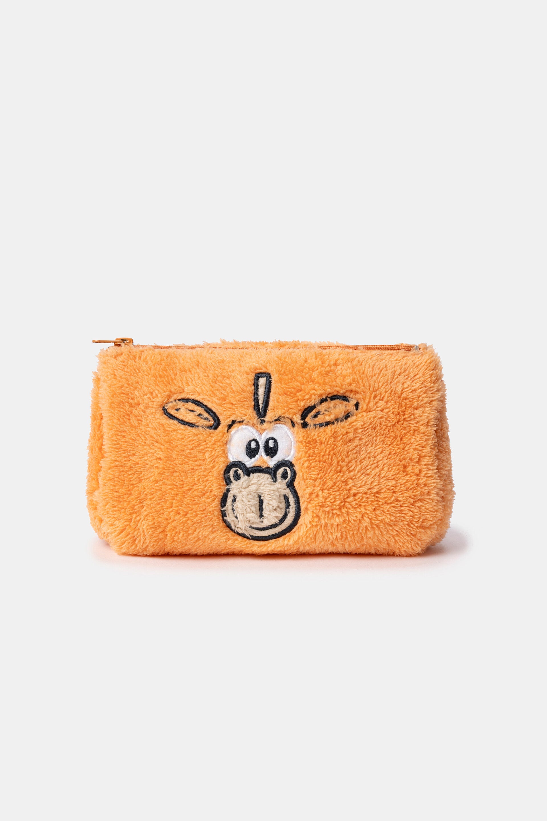 Zacht oranje teddy fleece tasje van Woody. Gebruik het als toilletzak of als pennenzak voor school. Het tasje heeft opvallende ogen en ponysnoet. 7x13cm groot.