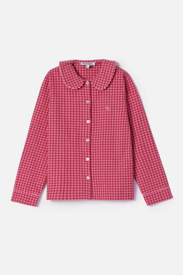 Pyjama van roze geweven katoen. De pyjama is geruit en de broek heeft zakken.