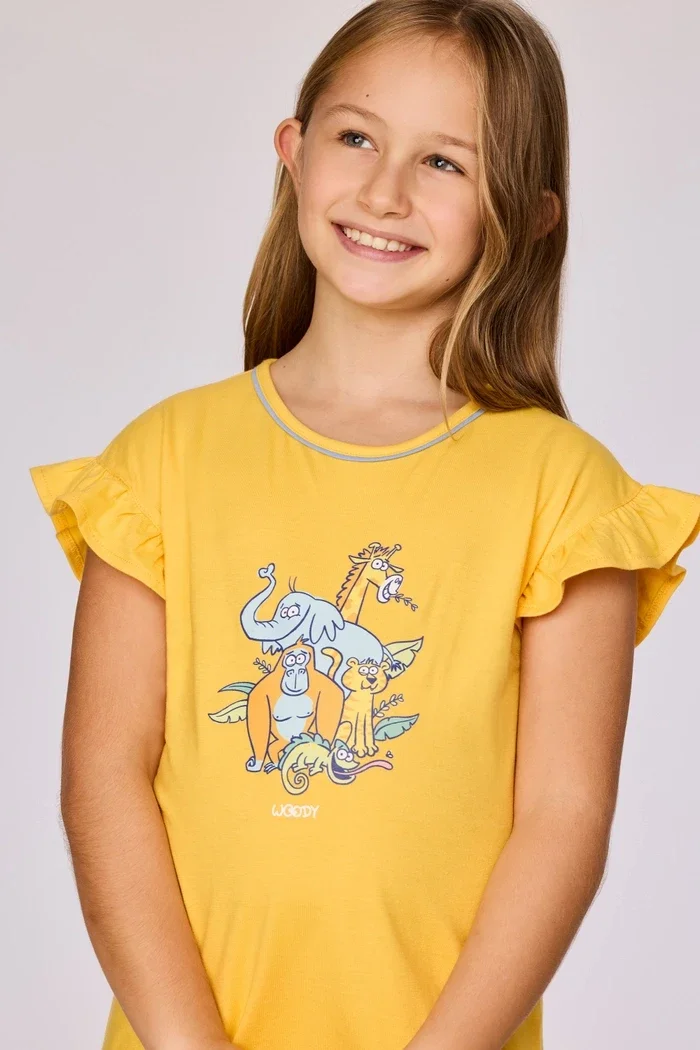 Geel slaapkleed van soepel katoen. Dit korte slaapkleedje heeft uitwaaierende korte mouwen. De blikvanger is de grote dierenprint. Deze speelse print licht op in het donker.