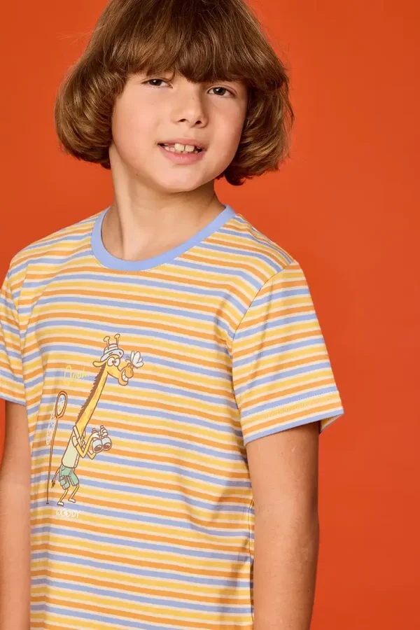 Jongens en heren pyjama van soepel katoen. Het gestreepte bovenstuk valt op door de grote vrolijke glow-in-the-dark dierenprint. Het bovenstuk wordt gecombineerd met een effen blauwe short.
